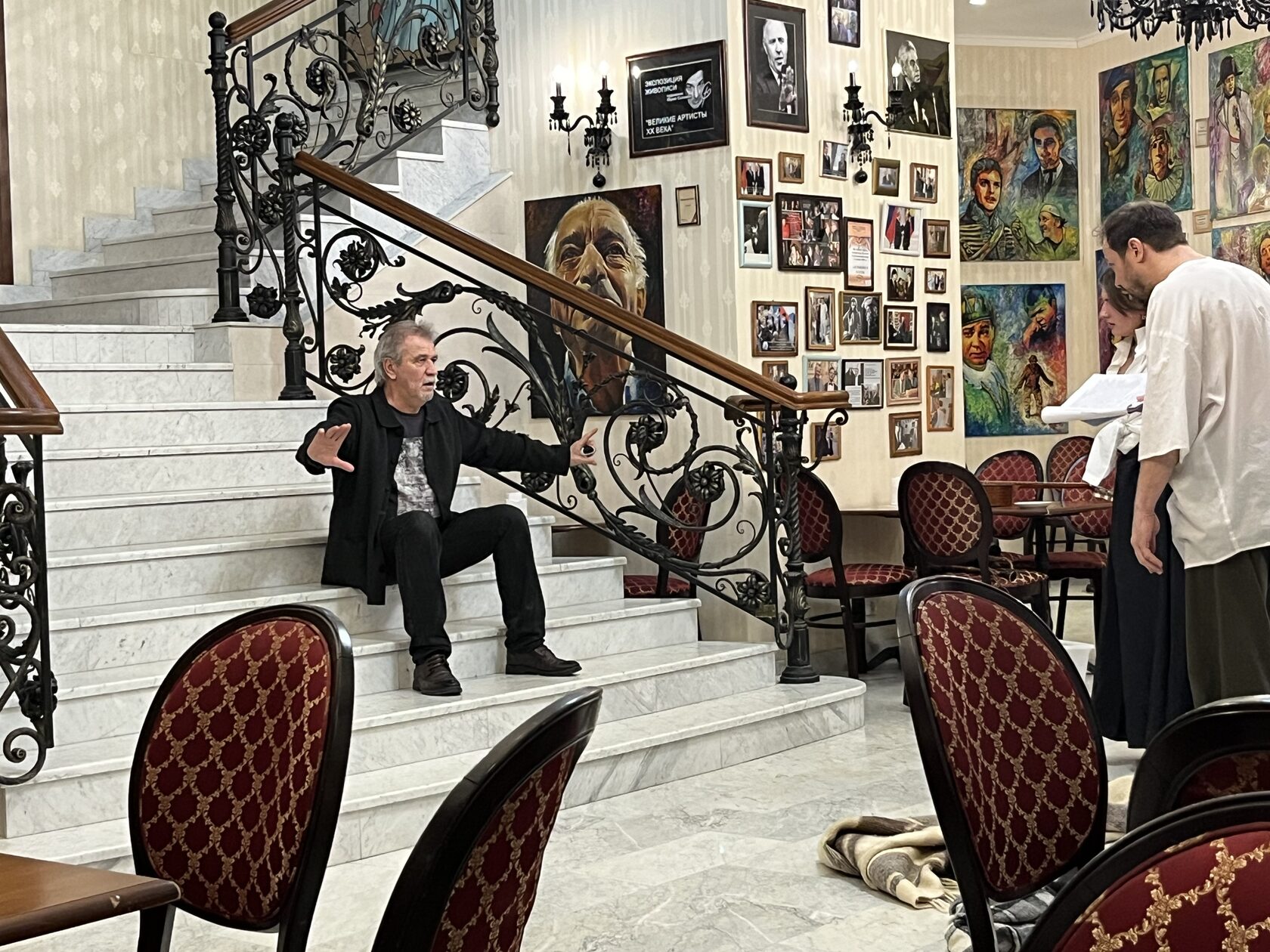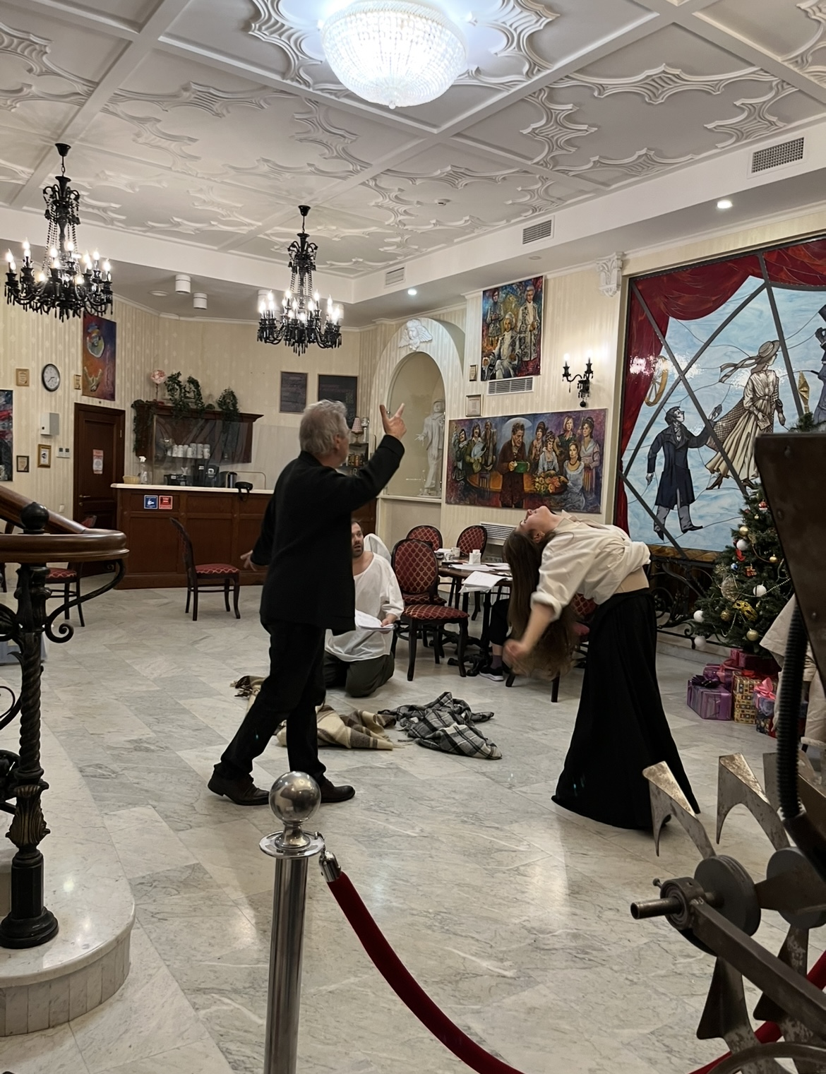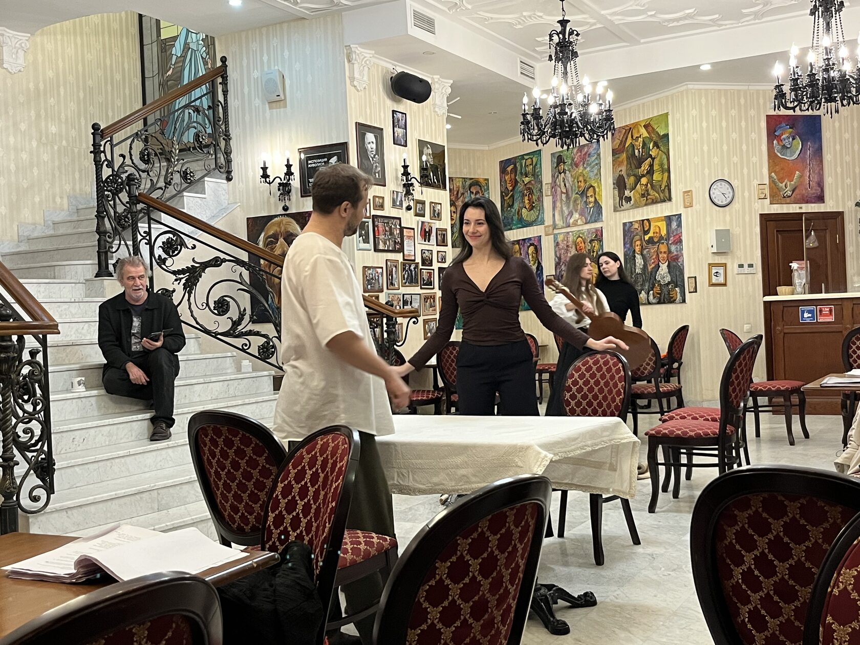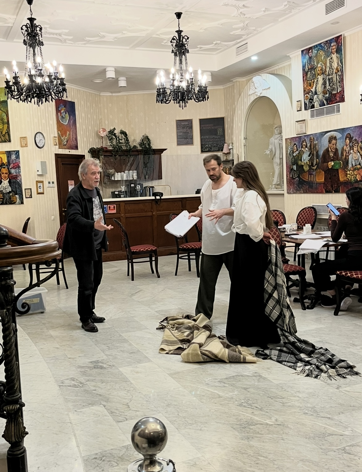В Мраморной гостиной театра на репетиции собрались режиссёр Юрий Цуркану и артисты Алексей Морозов (Федя Протасов), Кристина Белоусова (Лиза), Мария Мельникова (Маша, цыганка), Дарья Ануфриева (Саша, младшая сестра Лизы).