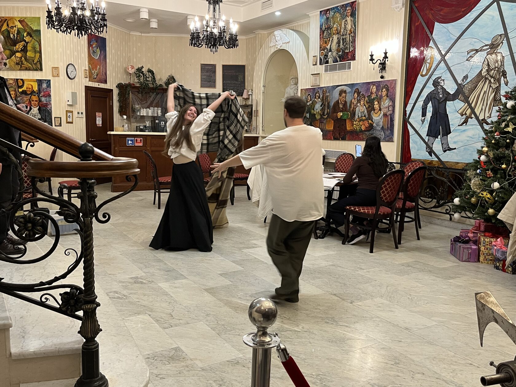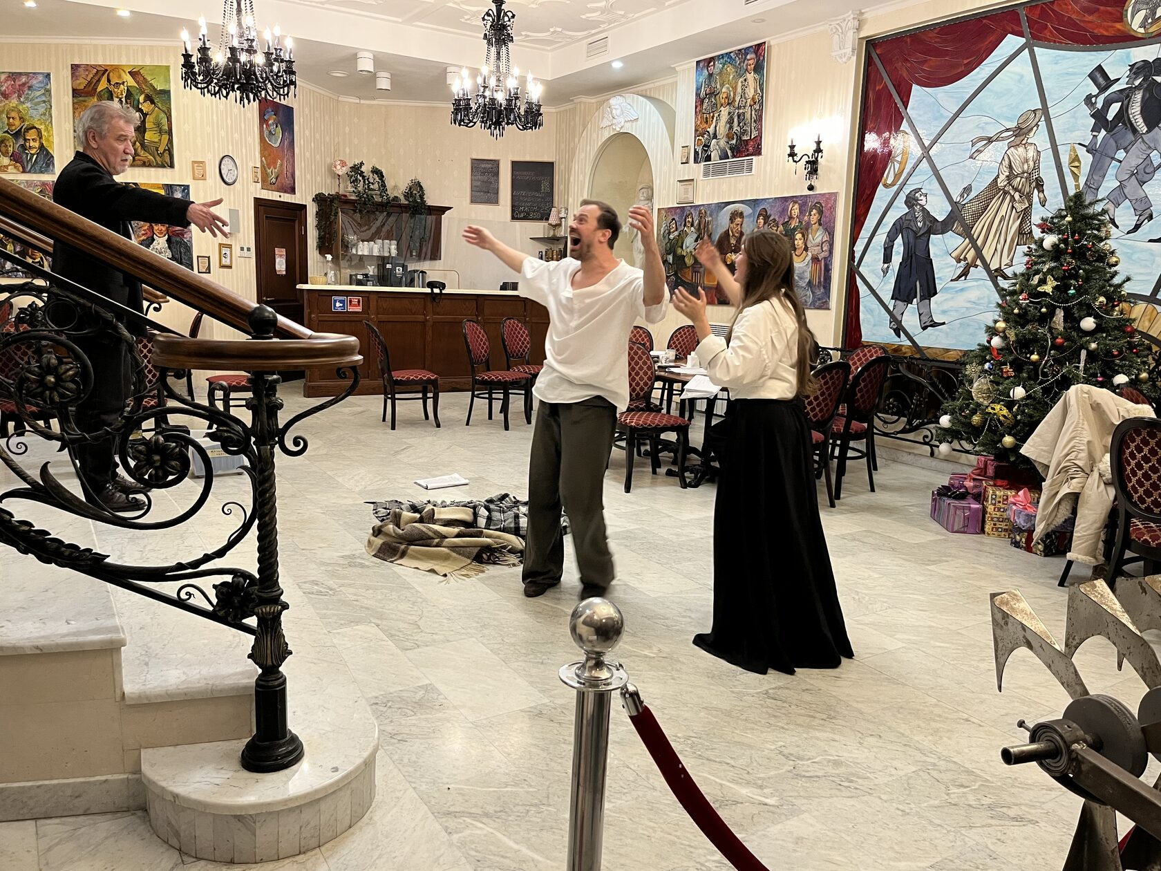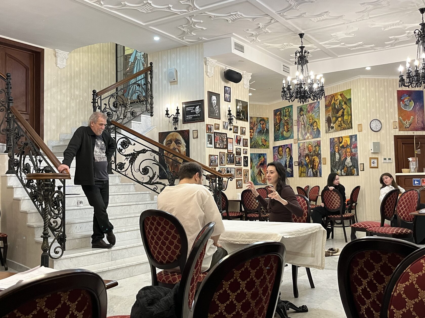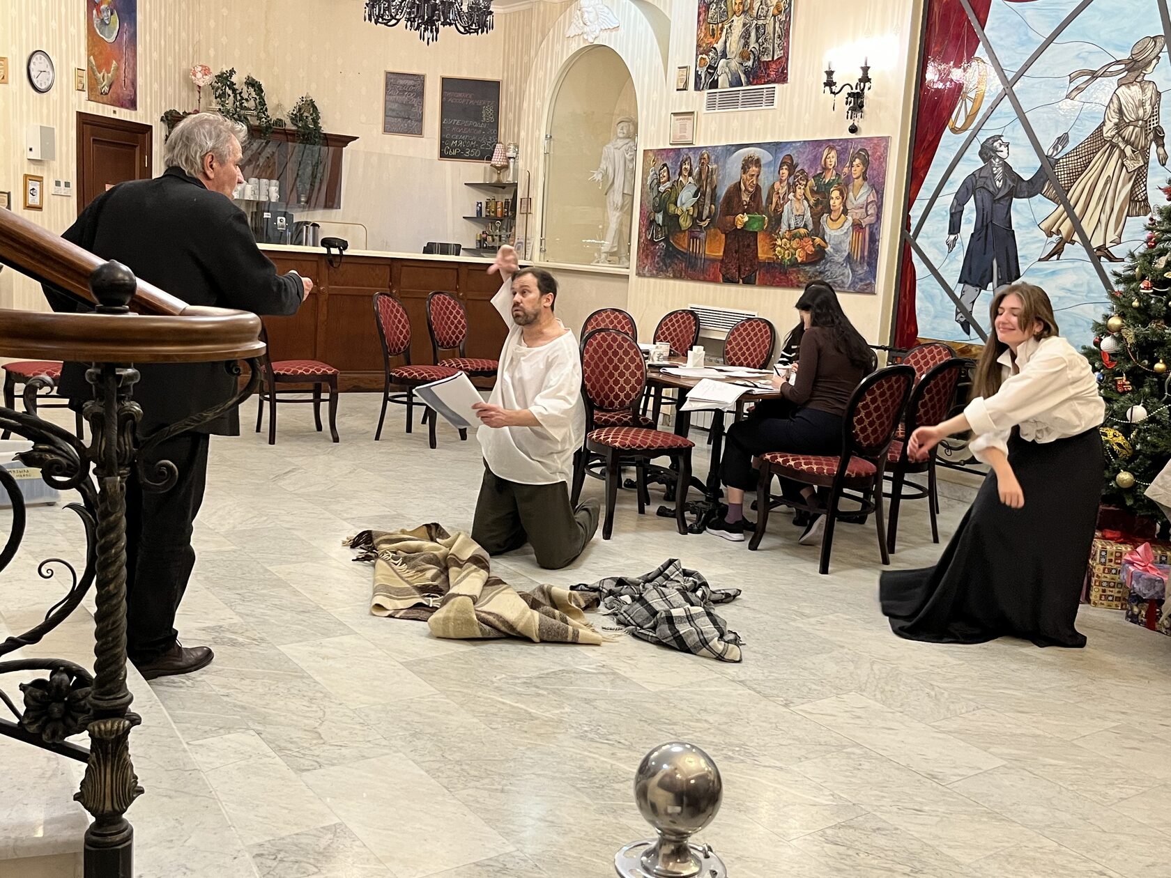В Мраморной гостиной театра на репетиции собрались режиссёр Юрий Цуркану и артисты Алексей Морозов (Федя Протасов), Кристина Белоусова (Лиза), Мария Мельникова (Маша, цыганка), Дарья Ануфриева (Саша, младшая сестра Лизы).