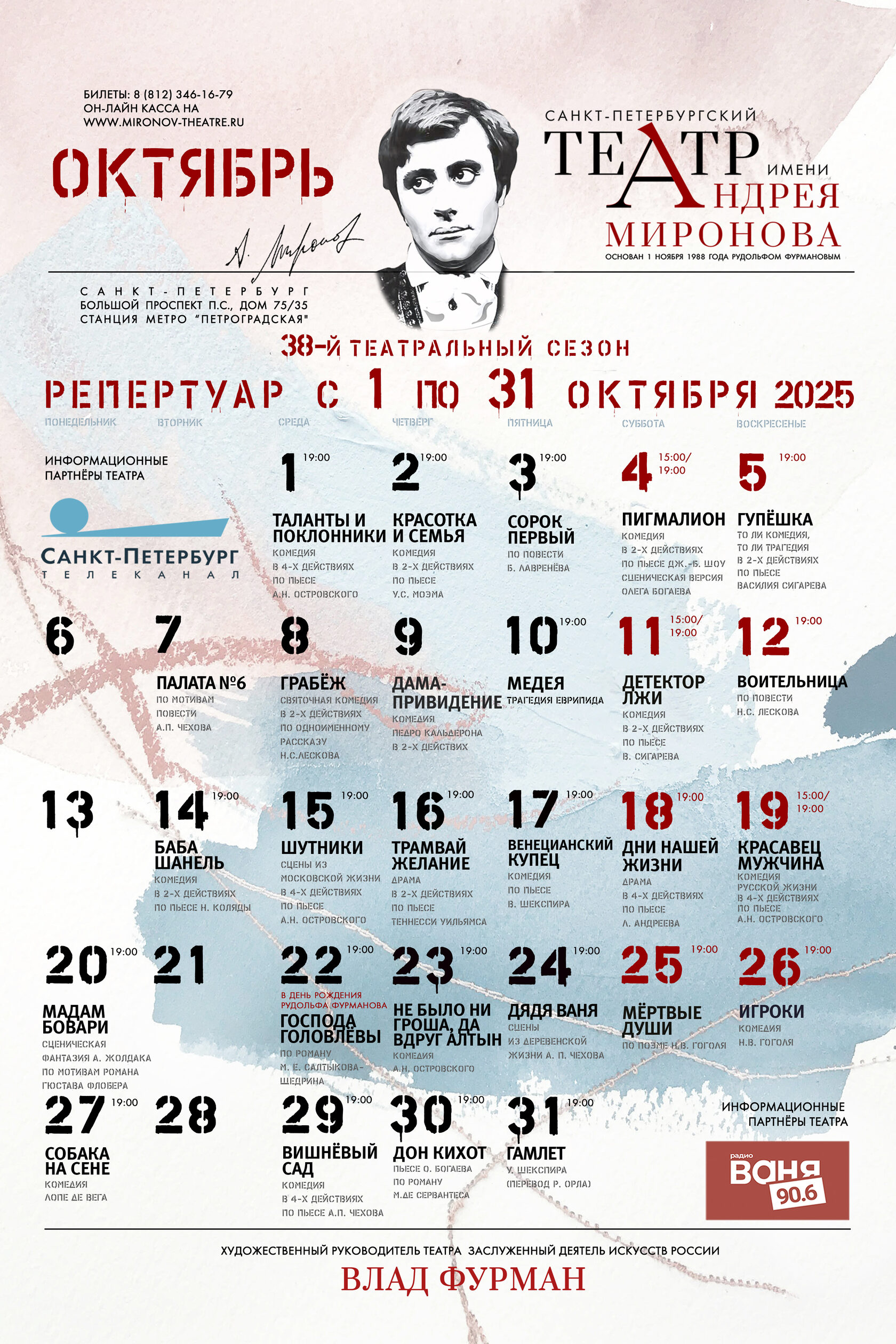 Любимые спектакли зрителей по произведениям А. Островского, Н. Лескова, А. Чехова, где и трагедия, и комедия идут рука об руку: «Палата № 6» Влада Фурмана |7 октября|, «Грабёж» Евгения Баранова |8 октября|, «Воительница» Антона Яковлева |12 октября|, «Шутники» Юрия Цуркану |15 октября|, «Красавец-мужчина» Юрия Цуркану |19 октября в 15.00 и 19.00|, «Не было ни гроша, да вдруг алтын» Юрия Цуркану |23 октября|, «Дядя Ваня» Алексея Морозова |24 октября|, «Вишнёвый сад» Юрия Цуркану |29 октября|.